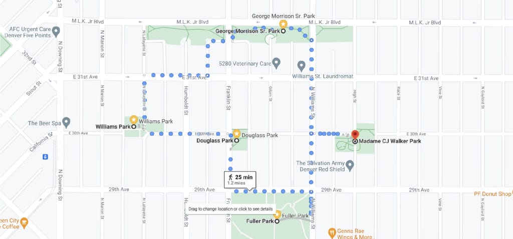 After making your way east across the park, turn north on Williams St. for a short walk to 30th Ave. where you’ll turn right and stoll into Madam. C.J. Walker Park.